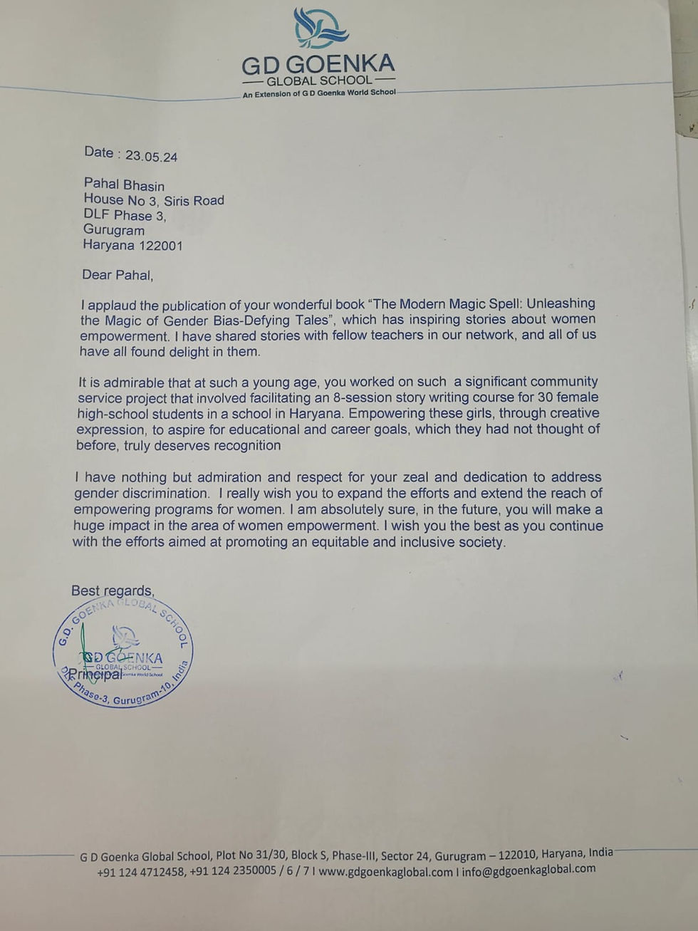 The testimonials from the Government Senior Secondary School in Nathupur reflect the meaningful impact of my project, which brings creative writing workshops focused on women’s empowerment to rural schools. Through these sessions, students learned how to build stories while engaging with ideas of self-reliance, ambition, and challenging gender roles. Many spoke about how the project helped them express their own goals -- like becoming teachers or air hostesses -- and encouraged them to think differently about their futures. One moment that stood out to me was when a student stayed back after class to share how she had never thought about writing her own story before, and how proud she felt seeing it take shape. The teacher highlighted how the workshops boosted the girls’ confidence and willingness to speak up, and the principal shared her appreciation for the project’s role in opening up new possibilities for the students.